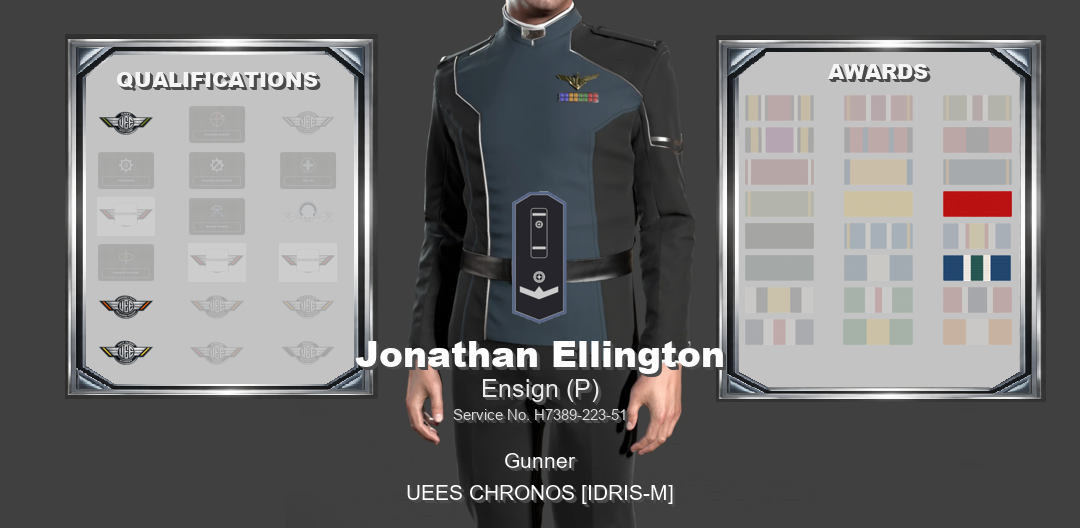 UNITED EMPIRE OF EARTH NAVY2ND FLEET 173RD BATTLEGROUP MILITARY HEADQUARTERS OFFICIAL PERSONNEL RECORDNAME: Jonathan Ellington CURRENT RANK: Ensign (P) RANK ABBREVIATION: ENS (P) STATUS: Active Service PRIMARY POSITION: Combat Pilot SPECIALTY: Remote Turret Specialist UNIT: UEES CHRONOS [IDRIS-M] OFFICIAL ENTRYBy direction of command, Jonathan Ellington is hereby awarded the First Deployment Commendation effective Oct 27, 2025. This award is entered in recognition of service honestly given and of a standard properly met. Not every achievement in this command is marked by high distinction or dramatic action, but that does not lessen its value. Steady service, commitment to duty, and the milestones earned along the way are what give a battlegroup its strength. Whether earned through time served, successful deployment, campaign participation, or continued contribution to the 173rd Battlegroup, this award reflects credit upon the member named above and recognises service that deserves to be recorded. You have earned this, and you have my thanks for the work behind it. This action is entered into the official personnel record as a formal award recognition. AUTHORITYBy authority of the Commanding Officer, this entry is entered into the official records of the 173rd Battlegroup and recognized as a formal personnel action of the United Empire of Earth Navy. SIGNED// VADM Marcus Jett 173rd Battlegroup Commander, 2nd Fleet RECORDS OFFICE USE ONLYFiled with the UEE Military Records Department Recorded by Petty Officer Jake Biggins