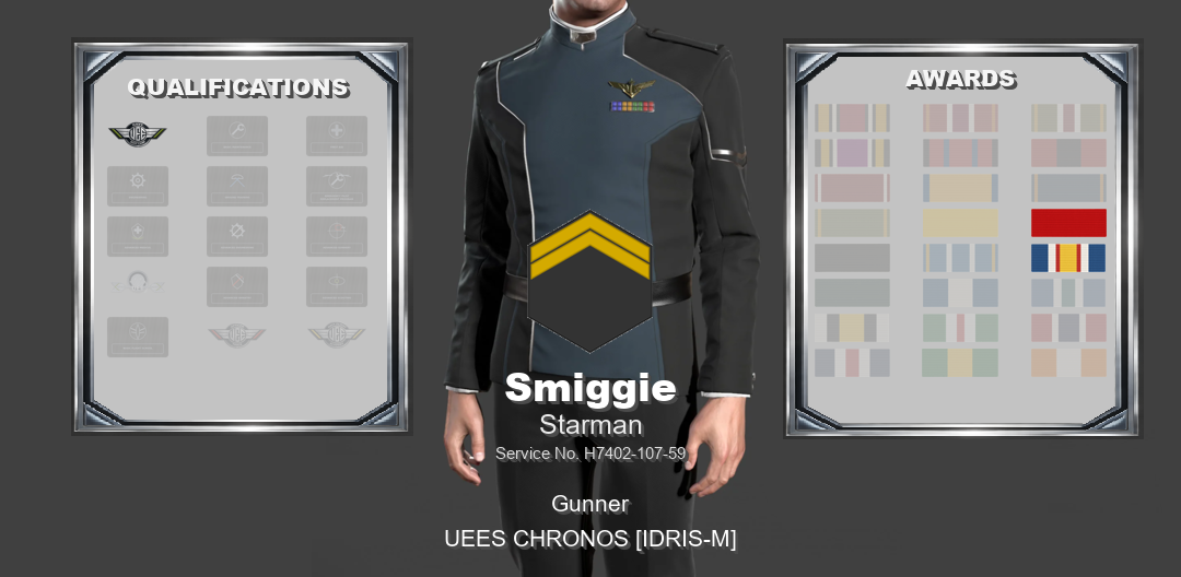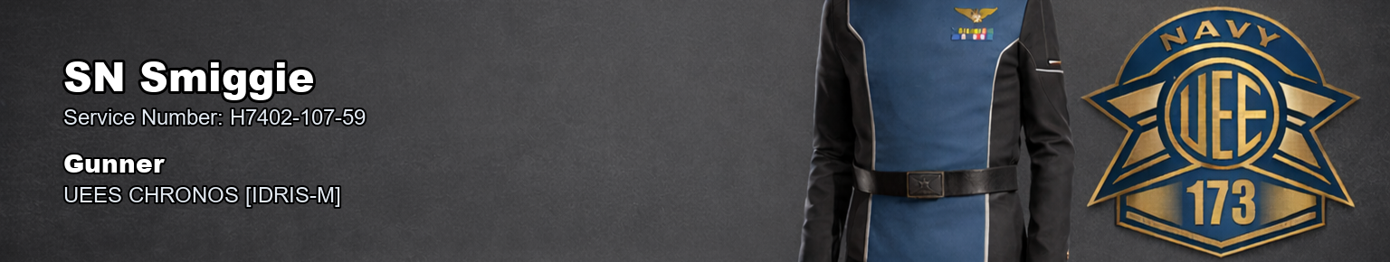 UNITED EMPIRE OF EARTH NAVY2ND FLEET 173RD BATTLEGROUP MILITARY HEADQUARTERS OFFICIAL PERSONNEL RECORDNAME: Smiggie CURRENT RANK: Starman RANK ABBREVIATION: SN STATUS: Affiliate Reservist PRIMARY POSITION: Gunner SPECIALTY: Remote Turret Specialist UNIT: UEES CHRONOS [IDRIS-M] OFFICIAL ENTRYBy direction of command, Smiggie is hereby awarded the First Deployment Commendation effective Feb 14, 2026. This award is entered in recognition of service honestly given and of a standard properly met. Not every achievement in this command is marked by high distinction or dramatic action, but that does not lessen its value. Steady service, commitment to duty, and the milestones earned along the way are what give a battlegroup its strength. Whether earned through time served, successful deployment, campaign participation, or continued contribution to the 173rd Battlegroup, this award reflects credit upon the member named above and recognises service that deserves to be recorded. You have earned this, and you have my thanks for the work behind it. This action is entered into the official personnel record as a formal award recognition. AUTHORITYBy authority of the Commanding Officer, this entry is entered into the official records of the 173rd Battlegroup and recognized as a formal personnel action of the United Empire of Earth Navy. SIGNED// VADM Marcus Jett 173rd Battlegroup Commander, 2nd Fleet RECORDS OFFICE USE ONLYFiled with the UEE Military Records Department Recorded by Petty Officer Jake Biggins