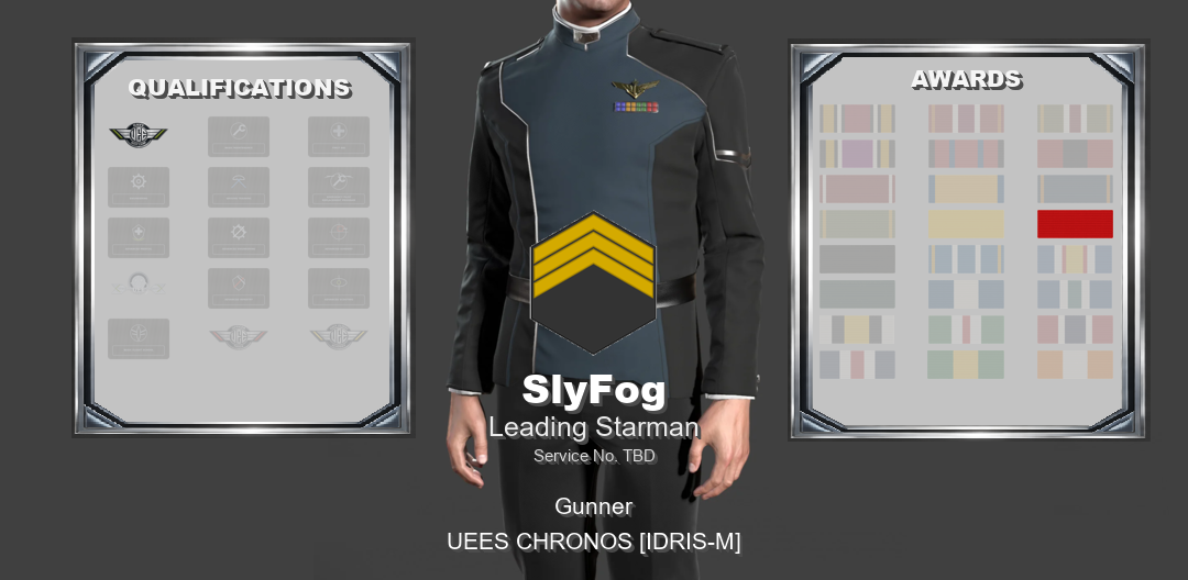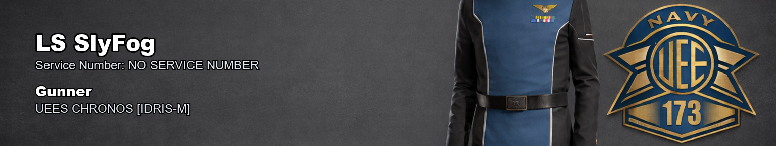 UNITED EMPIRE OF EARTH NAVY2ND FLEET 173RD BATTLEGROUP MILITARY HEADQUARTERS OFFICIAL PERSONNEL RECORDNAME: SlyFog CURRENT RANK: Leading Starman RANK ABBREVIATION: LSN STATUS: Active Service PRIMARY POSITION: Gunner SPECIALTY: Remote Turret Specialist UNIT: UEES CHRONOS [IDRIS-M] OFFICIAL ENTRYBy direction of command, SlyFog is hereby awarded the First Deployment Commendation effective Feb 14, 2026. This award is entered in recognition of service honestly given and of a standard properly met. Not every achievement in this command is marked by high distinction or dramatic action, but that does not lessen its value. Steady service, commitment to duty, and the milestones earned along the way are what give a battlegroup its strength. Whether earned through time served, successful deployment, campaign participation, or continued contribution to the 173rd Battlegroup, this award reflects credit upon the member named above and recognises service that deserves to be recorded. You have earned this, and you have my thanks for the work behind it. This action is entered into the official personnel record as a formal award recognition. AUTHORITYBy authority of the Commanding Officer, this entry is entered into the official records of the 173rd Battlegroup and recognized as a formal personnel action of the United Empire of Earth Navy. SIGNED// VADM Marcus Jett 173rd Battlegroup Commander, 2nd Fleet RECORDS OFFICE USE ONLYFiled with the UEE Military Records Department Recorded by Petty Officer Jake Biggins