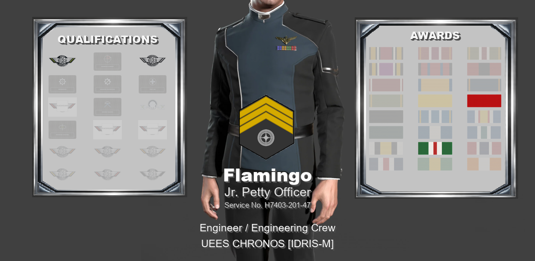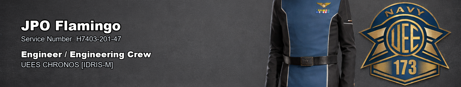 UNITED EMPIRE OF EARTH NAVY2ND FLEET 173RD BATTLEGROUP MILITARY HEADQUARTERS OFFICIAL PERSONNEL RECORDNAME: Flamingo CURRENT RANK: Jr. Petty Officer RANK ABBREVIATION: JPO STATUS: Active Service PRIMARY POSITION: Engineer / Engineering Crew SPECIALTY: Repair Specialist UNIT: UEES CHRONOS [IDRIS-M] OFFICIAL ENTRYBy direction of command, Flamingo is hereby awarded the First Deployment Commendation effective Feb 14, 2026. This award is entered in recognition of service honestly given and of a standard properly met. Not every achievement in this command is marked by high distinction or dramatic action, but that does not lessen its value. Steady service, commitment to duty, and the milestones earned along the way are what give a battlegroup its strength. Whether earned through time served, successful deployment, campaign participation, or continued contribution to the 173rd Battlegroup, this award reflects credit upon the member named above and recognises service that deserves to be recorded. You have earned this, and you have my thanks for the work behind it. This action is entered into the official personnel record as a formal award recognition. AUTHORITYBy authority of the Commanding Officer, this entry is entered into the official records of the 173rd Battlegroup and recognized as a formal personnel action of the United Empire of Earth Navy. SIGNED// VADM Marcus Jett 173rd Battlegroup Commander, 2nd Fleet RECORDS OFFICE USE ONLYFiled with the UEE Military Records Department Recorded by Petty Officer Jake Biggins
