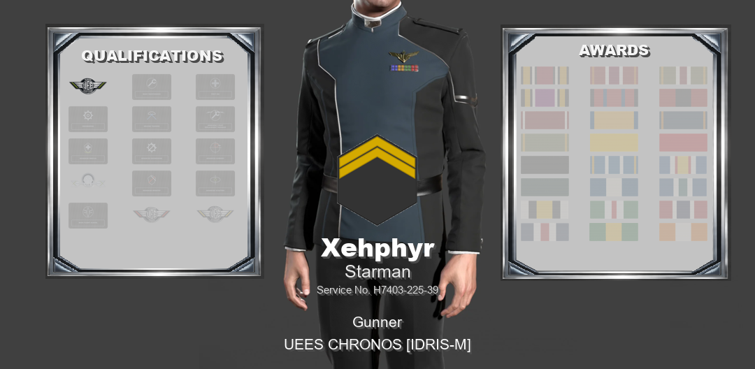 UNITED EMPIRE OF EARTH NAVY2ND FLEET 173RD BATTLEGROUP MILITARY HEADQUARTERS OFFICIAL PERSONNEL RECORDNAME: Xehphyr CURRENT RANK: Starman RANK ABBREVIATION: SN STATUS: Active Service PRIMARY POSITION: Gunner SPECIALTY: Manned Turret Specialist UNIT: UEES CHRONOS [IDRIS-M] OFFICIAL ENTRYBy direction of command, Xehphyr is hereby advanced to the rank of Starman effective Feb 28, 2026. The completion of Boot Camp marks the end of recruit training and the beginning of real service within the 173rd Battlegroup. You have met the required standard, earned your place in the line, and taken your first true step as a member of this command. From this day forward, more will be expected of you. Carry your rank with discipline, serve with purpose, and prove worthy of the trust now placed in you. This action is recorded as a formal Promotion within the official personnel record. AUTHORITYBy authority of the Commanding Officer, this entry is entered into the official records of the 173rd Battlegroup and recognized as a formal personnel action of the United Empire of Earth Navy. SIGNED// VADM Marcus Jett 173rd Battlegroup Commander, 2nd Fleet RECORDS OFFICE USE ONLYFiled with the UEE Military Records Department Recorded by Petty Officer Jake Biggins