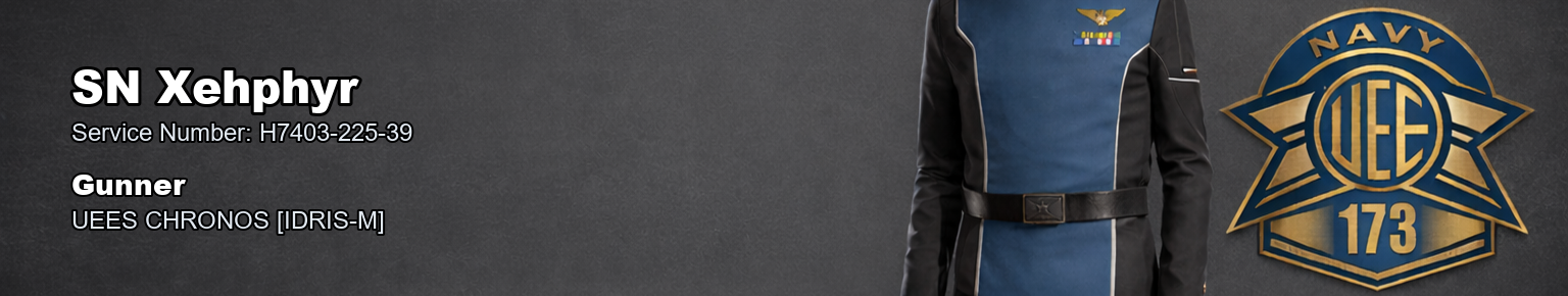UNITED EMPIRE OF EARTH NAVY2ND FLEET 173RD BATTLEGROUP MILITARY HEADQUARTERS OFFICIAL PERSONNEL RECORDNAME: Xehphyr CURRENT RANK: Starman RANK ABBREVIATION: SN STATUS: Active Service PRIMARY POSITION: Gunner SPECIALTY: Manned Turret Specialist UNIT: UEES CHRONOS [IDRIS-M] OFFICIAL ENTRYIt is hereby entered into record that Xehphyr has successfully completed the qualification designated as Boot Camp effective Feb 28, 2026. The completion of Boot Camp marks the end of initial recruit training and the beginning of real service within the 173rd Battlegroup. You have met the required standard, carried yourself through the demands of training, and shown that you are ready to move forward into the next stage of your service. Boot Camp is where every member first learns what will be expected of them in uniform. Discipline, reliability, bearing, and the ability to work as part of something larger than yourself all begin here. You have done what was required of you, and that deserves to be properly recognised. Take pride in completing it. You have earned that much. What matters now is what you do with it. This action reflects successful completion under command-recognized training and qualification authority. AUTHORITYBy authority of the Commanding Officer, this entry is entered into the official records of the 173rd Battlegroup and recognized as a formal personnel action of the United Empire of Earth Navy. SIGNED// VADM Marcus Jett 173rd Battlegroup Commander, 2nd Fleet RECORDS OFFICE USE ONLYFiled with the UEE Military Records Department Recorded by Petty Officer Jake Biggins