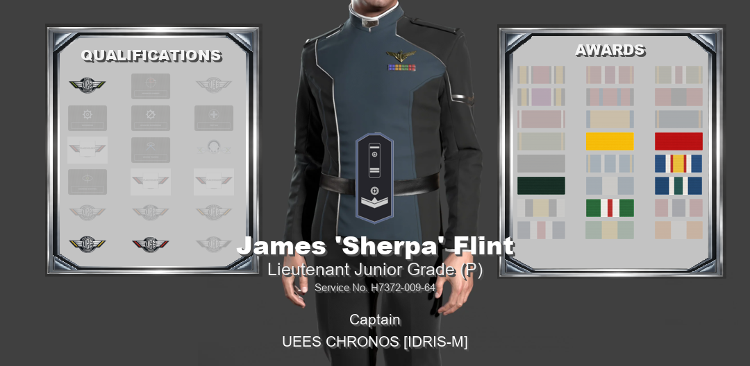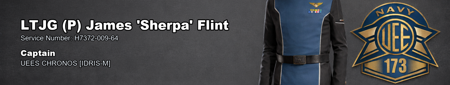 UNITED EMPIRE OF EARTH NAVY2ND FLEET 173RD BATTLEGROUP MILITARY HEADQUARTERS OFFICIAL PERSONNEL RECORDNAME: James 'Sherpa' Flint CURRENT RANK: Lieutenant Junior Grade (P) RANK ABBREVIATION: LTJG (P) STATUS: Active Service PRIMARY POSITION: Captain SPECIALTY: UNIT: UEES CHRONOS [IDRIS-M] OFFICIAL ENTRYBy direction of command, James 'Sherpa' Flint is hereby awarded the First Deployment Commendation effective Sep 8, 2025. This award is entered in recognition of service honestly given and of a standard properly met. Not every achievement in this command is marked by high distinction or dramatic action, but that does not lessen its value. Steady service, commitment to duty, and the milestones earned along the way are what give a battlegroup its strength. Whether earned through time served, successful deployment, campaign participation, or continued contribution to the 173rd Battlegroup, this award reflects credit upon the member named above and recognises service that deserves to be recorded. You have earned this, and you have my thanks for the work behind it. This action is entered into the official personnel record as a formal award recognition. AUTHORITYBy authority of the Commanding Officer, this entry is entered into the official records of the 173rd Battlegroup and recognized as a formal personnel action of the United Empire of Earth Navy. SIGNED// VADM Marcus Jett 173rd Battlegroup Commander, 2nd Fleet RECORDS OFFICE USE ONLYFiled with the UEE Military Records Department Recorded by Petty Officer Jake Biggins